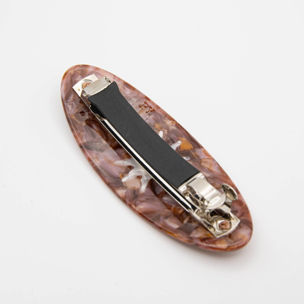 The French style barrette hair clip from Pepper You has an oval shape and curved design - which is perfect for half or full holds on all types of hair. The metal fastening provides a strong hold, with no snag, and the neutral brown colour with golden sol accents will bring some playfulness to your everyday style.