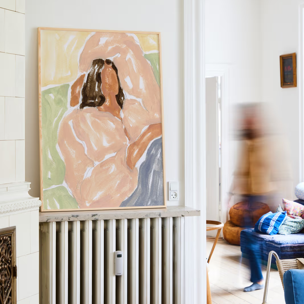 The Spring Afternoon art print by the French artistic duo Sacrée Frangine (Sacred Sister) is inspired by the quiet beauty of everyday life. It features a moment of relaxation with a person lounging in a soft pink sweater.
