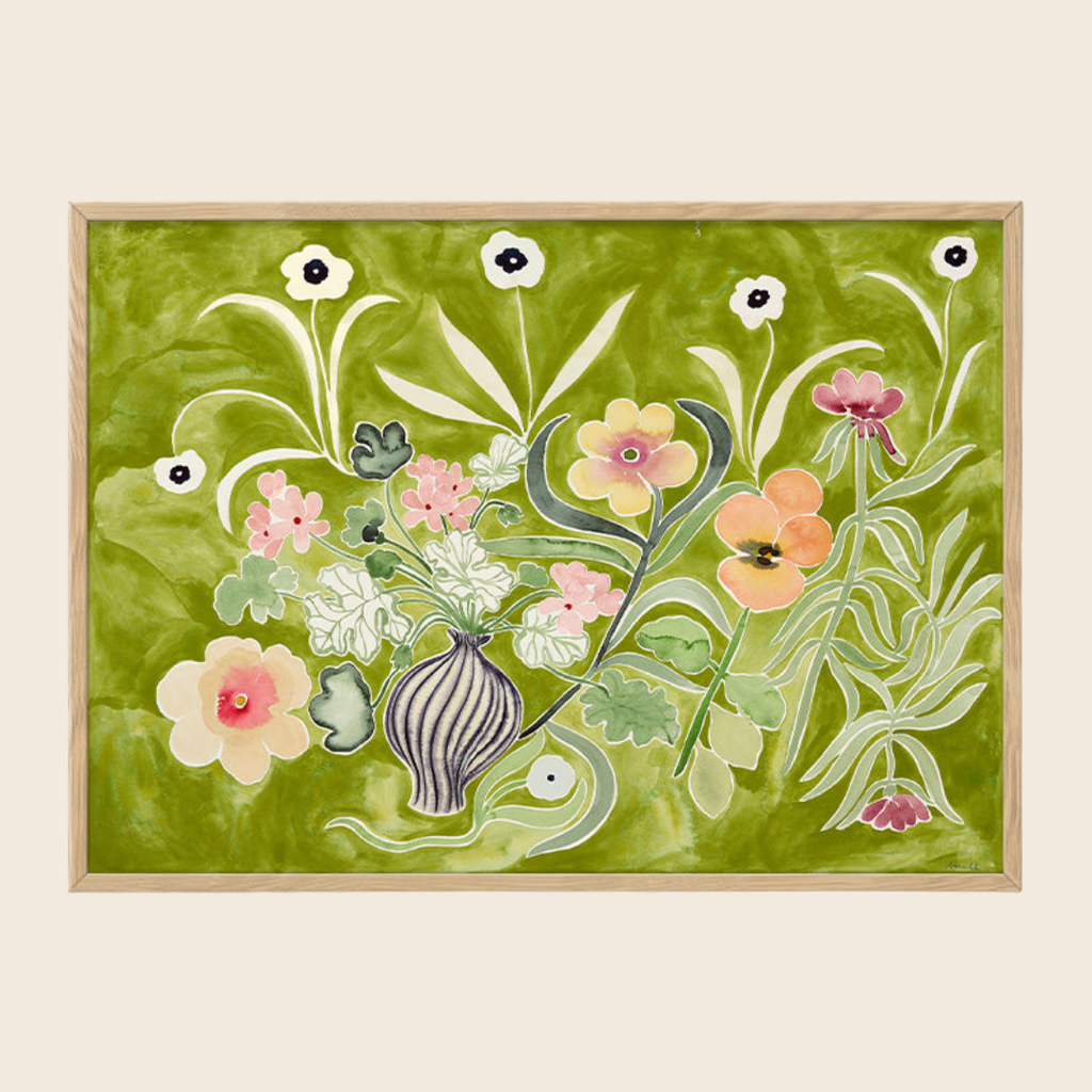 The Green Flora print by La Poire is a beautiful depiction of the most beautiful blooms spilling out of a sculptural striped vase. Set against a painterly green background, this print will create an impact on your walls and add a touch of femininity to any room.