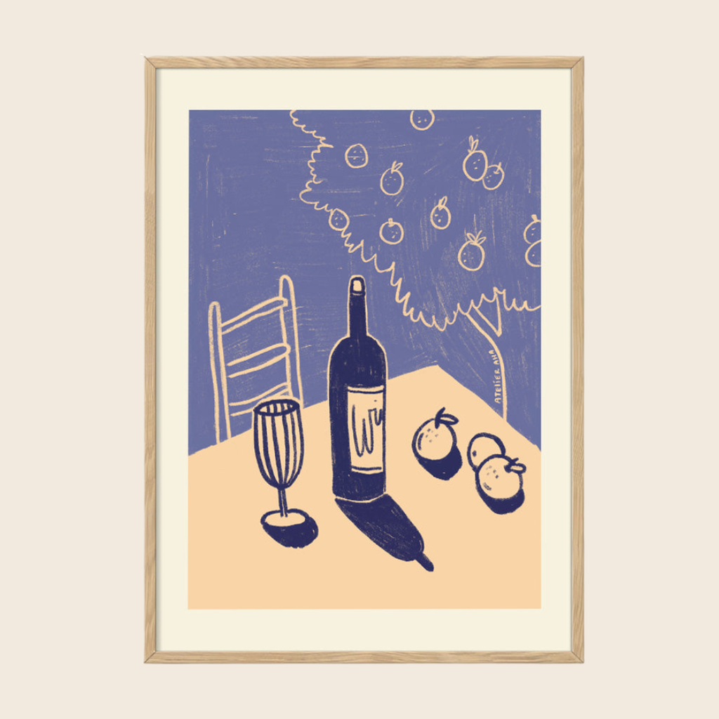 The Wine and Oranges print by Dutch illustrator, Anouk van Cleef, is a cool blue still life of a garden scene, featuring a bottle of wine on a table, with oranges picked from a nearby tree. The print creates a sense of warmth and comfort in the everyday moments of being at home.