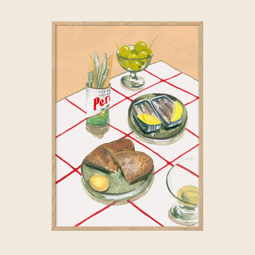 The Wine Night print by Laura Page captures a perfect scene of all the picky bits that go with your weekend wine night. Perello olives, sardines and thick slices of bread set on a red and white tiled table and soft peach background. The brushstrokes and textures are visible within the print, which adds to the hand-made feel of the work.